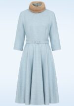 “Winter wonder in icy blue!” Voeg een vleugje elegante charme toe aan je garderobe met deze lichtblauwe swing jurk. Ze heeft een hoge halslijn, flatterende 3/4 mouwen en een zwierige swing rok die je silhouet prachtig laat uitkomen. Het afneembare imitatiebont kraagje geeft je look een cozy, luxe touch, terwijl de zachte en soepel vallende stofmix met een vleugje viscose en een lichte stretch zorgt voor optimaal draagcomfort. * Swing model * Hoge halslijn * Afneembaar bontkraagje * 3/4 mouwen * Zijwaartse steekzakken * Afneembare riem * Rits- en knoopsluiting achterzijde * Valt bij een lengte van 1,70 m over de knie