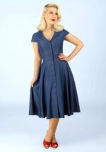 ”Turning heads with a touch of blue!” Onze Angie Chambray swing jurk uit de nieuwe Topvintage Boutique Collection is door onze eigen in-house designers ontworpen en exclusief bij Topvintage verkrijgbaar! Ze is uitgevoerd in een luchtige en soepel vallende, blauwe chambray katoenmix met een lichte stretch, waardoor ze heerlijk comfortabel draagt. Swing de dagen door met Angie! * Swing model: kan gecombineerd worden met een van onze petticoats * Korte kapmouwtjes * Gevoerde top * Knopenrij * It has pockets! * Gorgeous Julia Fiore (Fiorevanil) is 1,70 m; haar pumps zijn haar eigen vintage treasures * Exclusief bij Topvintage verkrijgbaar
