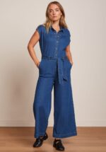 ”Denim & jumpsuits; never underestimate the power of a great combo!” Deze óh zó comfortabele jumpsuit heeft een puntige kraag, knopenrij en speelse plooitjes aan de voorzijde. Ze is uitgevoerd in een soepele en luchtige blauwe Bio katoenmix voorzien van een lichte stretch. * Puntig kraagje * Knopenrij * Verborgen ritssluiting aan de voorzijde * Plooitjes aan de voorzijde * Korte kapmouwtjes * Voorzien van steekzakken! * Afneembare strikband voor een extra ‘snatched’ taille * Lange wijde pijpen