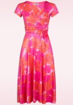 ”Bloom baby, bloom!” Beautiful Andi heeft een vaste overslag top met elegante V-halslijn, korte mouwtjes en loopt vanaf de flatterende geplooide tailleband uit in een semi-swing rok tot over de knie. Ze is uitgevoerd in een soepele en stretchy, licht glanzende en slinky roze stof met een romantische print van bloemen in oranje en roze tinten. Bovendien is ze ideaal voor mee op reis, want ze is licht van gewicht en kreukt niet! * Semi-swing model * V-halslijn * Vaste overslag * Korte mouwen * Geplooide tailleband met vaste strik * Geen rits of knopen; aantrekken en ready to go! * Valt over de knie bij een lengte van 1,70 m