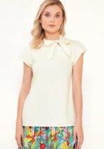 Classy met een vleugje cute… de Anna top is een echte fashion statement! Ze is uitgevoerd in soepel en luchtig 100% katoen dat heerlijk draagt en niet stretcht. De frisse ivoorwitte tint geeft haar een tijdloze, elegante uitstraling. * Hoge halslijn met klein opstaand kraagje * Vaste strikbanden * Plooitjes detail op de borst * Korte kapmouwtjes * Lang genoeg om op een normale heupbroek te dragen
