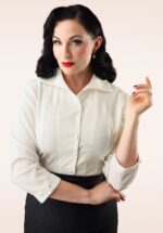 ”Life needs a few more polka dots!” Deze cutie heeft een omslagkraagje met vaste strikbanden, lange mouwen en prachtige goudkleurige knoopjes met een zwart fluwelen afwerking. Ze is uitgevoerd in een stevige, maar soepele en stretchy creme kleurige stof, voorzien van zwarte polka dots. * Korter model * Omslagkraagje met vaste strikbanden * Lange mouwen * Gouden knopenreeks met fluwelen afwerking