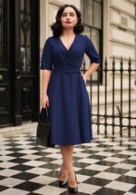 “You will always attract what you believe you’re worth!” Ook dit seizoen voorzien onze in-house designers ons weer van draagbare en klassieke items met een hypervrouwelijk silhouet voor alle ”Power Women”. Nancy is een ‘ready to go’ overslag A-lijn jurk met een classy V-hals en is uitgevoerd in een stevige maar toch soepele, donkerblauwe stof met een lichte stretch die ook nog eens heerlijk draagt! ‘No need to chase’…. want deze jurk heeft jou al gevonden, Hunnie! * A-lijn * V-halslijn met overslag * 1/2 mouwtjes met omslagjes * Gevoerde top * Afneembare stoffen riem voor een extra ‘snatched’ taille * Voorzien van zakken! * Sierknoopjes * Blinde rits aan de achterzijde * Stunning Lira Karina is 1,56 m: haar pumps en accessoires zijn haar eigen treasures * Let op; de kleur van het product op de video kan afwijken van de daadwerkelijke kleur van het product