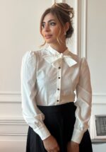 ”Stay classy… stay fabulous!” Deze klassieke beauty heeft vaste strikbanden, lange pofmouwen met manchetten en schattige bloemvormige knoopjes. Ze is uitgevoerd in een soepele en licht stretchy witte stof voorzien van een structuur van kleine dotjes. * Klein opstaand kraagje * Vaste strikbanden * Lange pofmouwen met manchetten * Bloemvormige knopen * Lang genoeg om op een normale heupbroek te dragen * Let op; de kleur van het product op de video kan afwijken van de daadwerkelijke kleur van het product