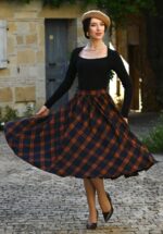 “Rich checks, timeless swing.” Tira wordt hoog in de taille gedragen vanwaar ze uitloopt in een zwierige full swing rok met handige zijwaartse steekzakjes. Uitgevoerd in een stevige maar zachte stof (stretcht amper) met een klassieke ruit in donkerblauw en roestbruin. * Swing stijl * Zijwaartse steekzakken * Blinde rits zijkant * Kan gecombineerd worden met een van onze petticoats * Valt bij een lengte van 1,70 m over de knie