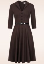 ”Effortlessly chic, effortlessly me!” Deze classy semi swing beauty heeft een elegante v-halslijn met revers kraag, decoratieve knoopjes aan de voorzijde en is voorzien van handige steekzakken. Ze is uitgevoerd in een stevige maar stretchy bengaline achtige donkerbruine stof voorzien van een witte krijtstreep, die heerlijk comfortabel draagt. * Swing model * V-halslijn met revers kraagje * Sierknopen aan de voorzijde * 3/4 mouwen * Afneembaar lakriempje, voor een extra ‘snatched’ taille * Voorzien van zakken! * Blinde rits achterzijde * Valt bij een lengte van 1,70 m net over de knie * Exclusief bij Topvintage verkrijgbaar